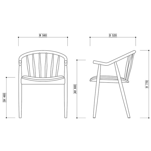 優雅なアームフレームがカフェレストラン空間に寛ぎと癒しを提供します。背もたれデザインはスポークとウッドパネルの2タイプご用意。